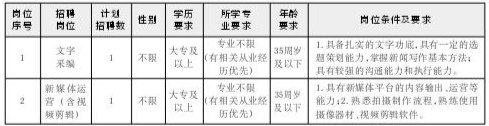 舟山传媒文化有限公司因事业发展需要,面向社会公开招聘2名工作人员(劳务派遣性质),具体要求如下:
