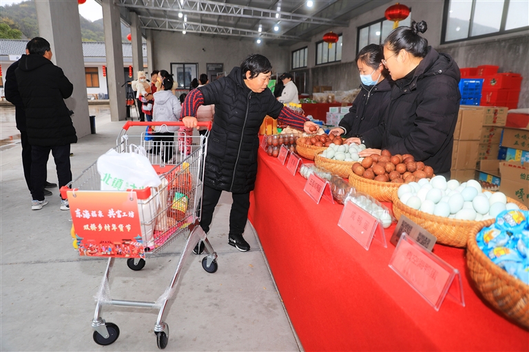 近日,定海区双桥街道首届年货节,在紫微村东海福泉共富工坊举行。年货节集市设置五谷杂粮区、禽肉区、本地特产区等区域,吸引许多当地村民和游客前来采购。