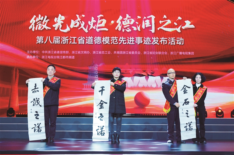 戎儿(左二)在“微光成炬·德润之江” ——第八届浙江省道德模范先进事迹发布现场