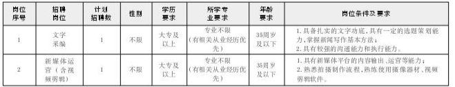 舟山传媒文化有限公司因事业发展需要,面向社会公开招聘2名工作人员(劳务派遣性质),具体要求如下: