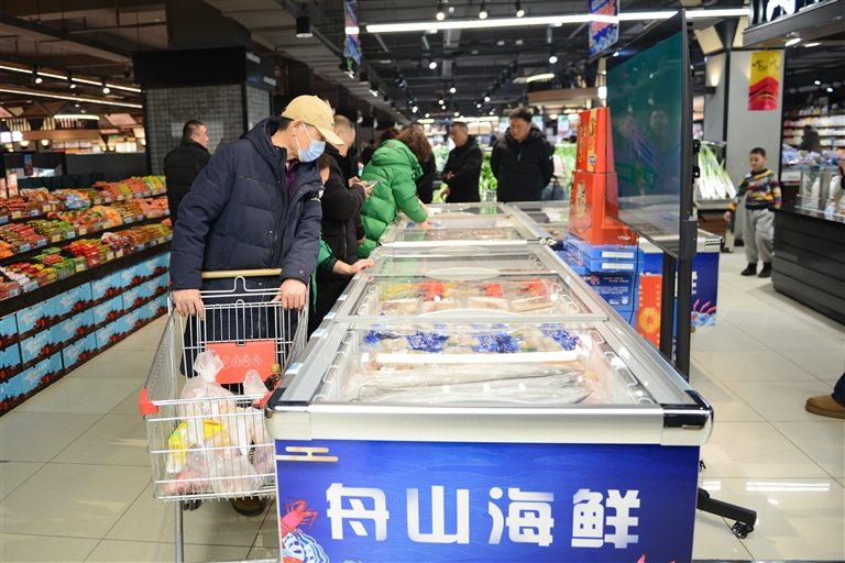 1月12日上午,松原市飞宇超市内人头攒动,二楼的生鲜区域熙熙攘攘。“您看看,这是刚从舟山来的梭子蟹。”“带鱼都是渔船上直接冷冻的,都挺新鲜。”生鲜销售员张丽申分外忙碌,刚给一个顾客介绍完,又要接待另一个顾客。