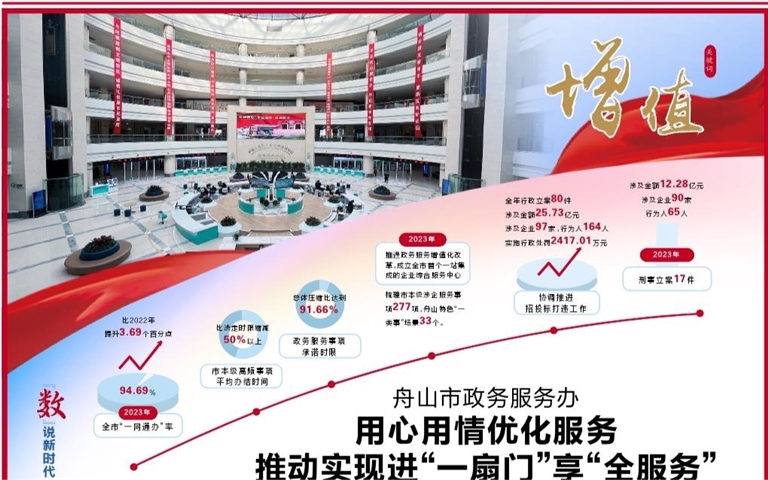在政务服务增值化改革方面,推动形成“一心多岛(园区)多链条”特色增值服务体系,成立全市首个一站集成企业综合服务中心。梳理市本级涉企服务事项277项,舟山特色“一类事”场景33个。为企业帮办代办各类服务9000余件次。建设的“舟到助企”平台累计办理涉企服务事项907件。帮助企业解决各类问题572个;