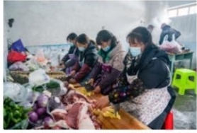 1月24日,在镇雄县塘房镇凉水村和平小学老校区安置点,周边村寨前来帮忙的村民在切菜。