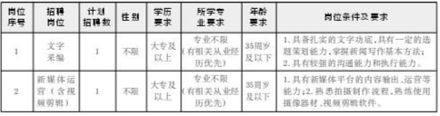 舟山传媒文化有限公司因事业发展需要,面向社会公开招聘2名工作人员(劳务派遣性质),具体要求如下: