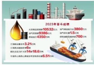 2023年,我市深入实施自贸试验区提升战略,实现大宗商品贸易额10532亿元,油气贸易额9386亿元,原油加工4350万吨,油气储运能力达3860万方,实现油气吞吐量1.5亿吨、保税油供应量突破700万吨。其中,原油加工量完成年度目标的108.8%;油气吞吐量完成年度目标的111.1%;舟山保税船燃加注量704.64万吨,同比增长16.95%,稳居全国第一船加油港。