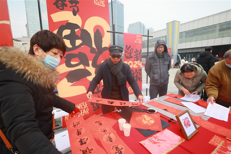 新的一年一定要红红火火,春联、福字、红灯笼……春节迎新家居装扮必配“套装”,让新年氛围感一整个“拉”满。现场的手写春联摊位上最热闹,市民徐先生好不容易“抢”到一副对联,赶紧细心地收好。“我们家每年都会贴新对联,本来打算买现成的,看到这里有手写的,就顺便领一副。手写的更有年味。”他兴奋道。