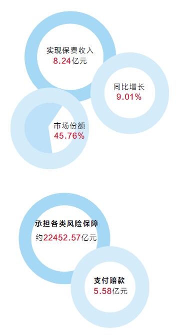 2023年,人保财险舟山市分公司全年累计实现保费收入8.24亿元,同比增长9.01%,市场份额45.76%,全年累计为全市承担各类风险保障共计约22452.57亿元,支付赔款5.58亿元。