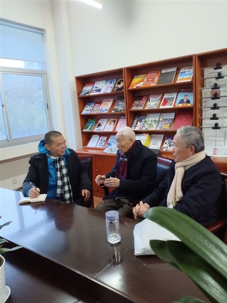 作者(左一)采访登步岛战斗的亲历者毛德传老人(中)