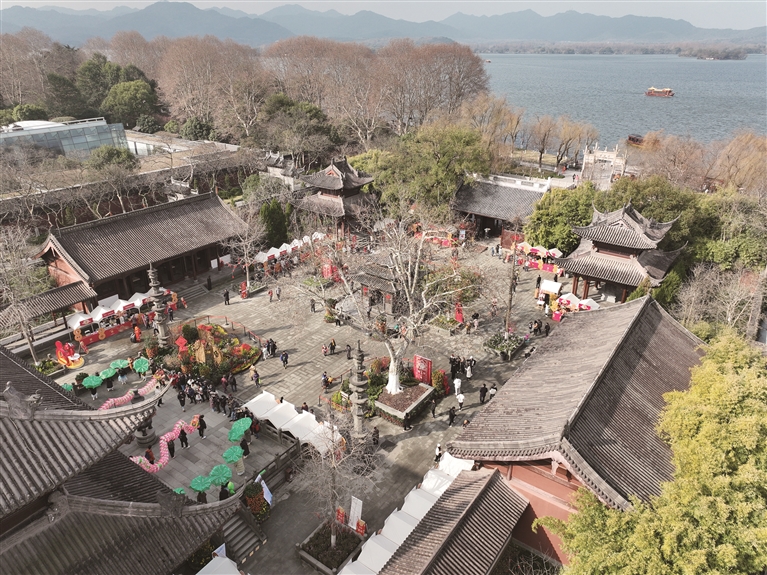 2月5日,人们在西湖迎春花展上观看表演(无人机照片)。