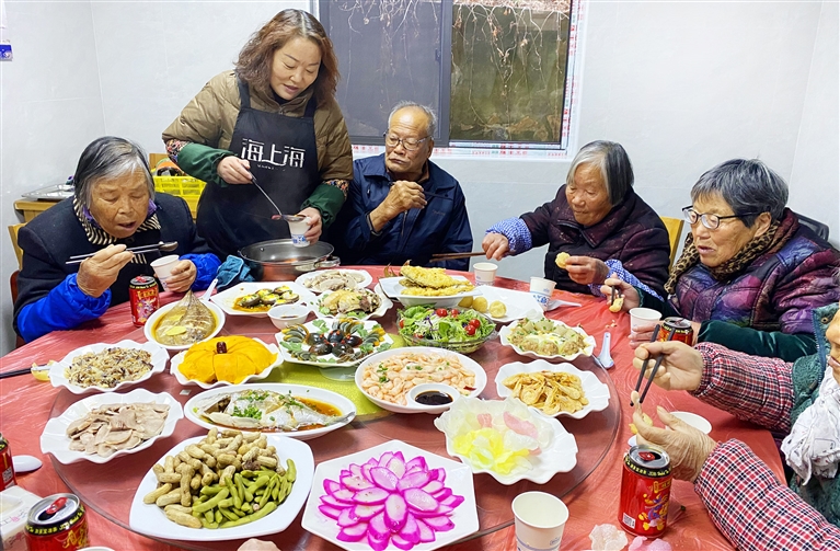 看老人们吃得开心,王淑飞的心里也美滋滋。“镇里领导交代好几遍了,老人们住到这里的第一顿年夜饭,一定要花心思好好做,多做些对老年人口味的、有好寓意的菜。”王淑飞说,早在三四天前,他们就开始准备起了年夜饭所需的食材,并着手“试验”创新菜,“让住在这里的阿伯阿姨高兴满意,这就是我们的目标。”