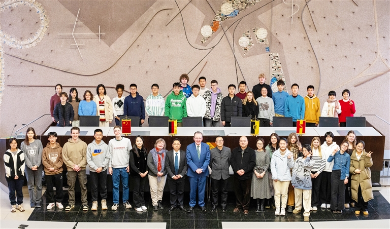 在卡尔斯鲁厄市市政厅,市长阿尔伯特·考夫莱茵与中德学生及代表团工作人员合影 德国《巴登日报》记者供图