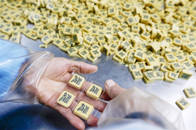 1月31日,工作人员在包装嵌字豆糖。新春佳节将至,在安徽省黄山市祁门县,嵌字豆糖非遗传承人经过熬糖、磨粉、搅拌、压实、制字、拉伸、切片等手工工序制作嵌字豆糖。嵌字豆糖在切开的每块糖片中,都会蕴藏着一个吉祥如意的汉字,是一种可食可赏的特色糕点。新华社 发(施亚磊 摄)
