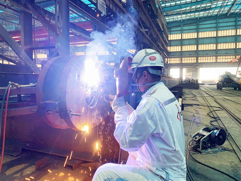 临近春节,走进惠生清洁能源科技集团股份有限公司舟山基地,记者看到焊工李永兵一手举着面罩,一手拿着焊枪,正在焊接脚旁的一个零件,焊花不停闪耀。摘下电焊面罩,“90后”李永兵笑着对记者说:“最近一直在忙,为了赶工期,拼装场地晚上也得加班,今年过年我们不少伙伴要在这里过了。”