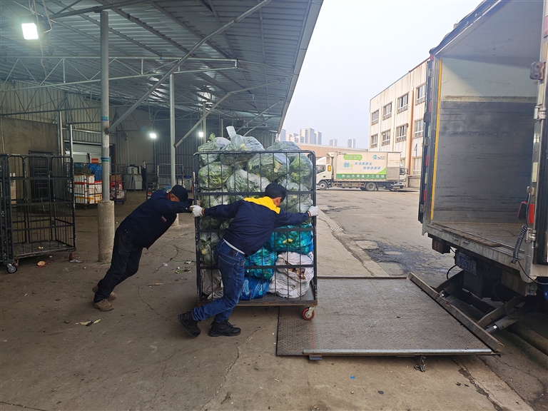 “过来搭把手,马上装车出发了!”大年三十7时,市菜篮子服务有限公司团购营销中心仓库内,一辆辆货车整齐排列。配送员毕厚福戴着白手套,正用力地把一笼笼比他人还高的蔬菜货物推上货车(见图),这批货物马上就将被送到新城惠众广场菜篮子门店。