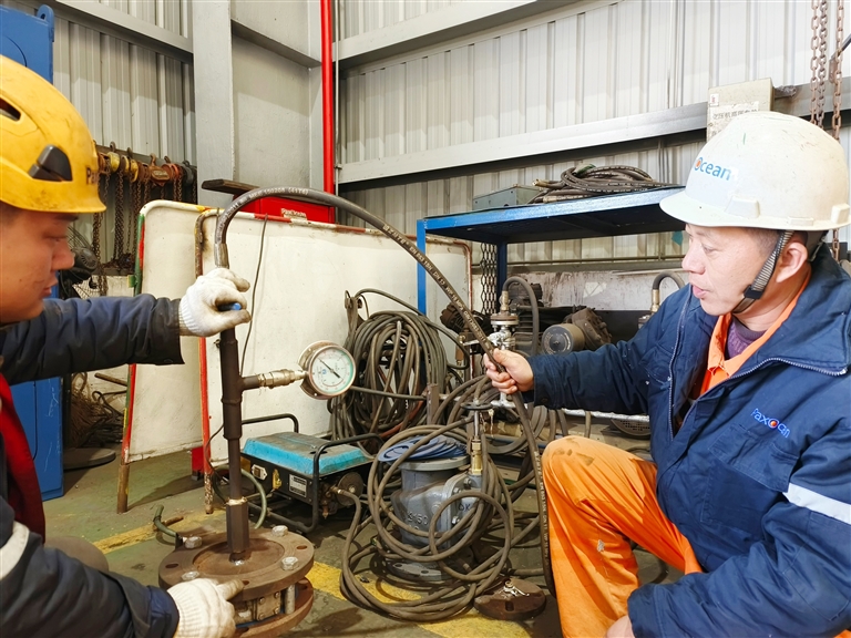 走到阀件区,试验台上整齐摆放着刚维修好的截止阀、蝶阀等各类阀件。朱华君逐个仔细查看,并与同事马超进行最后一步的压力和密封性能试验,确保阀件维修合格。“质量是企业的生命,我每天都会仔细检查,如果某一环节出错,会影响船舶的航行安全。”朱华君说。