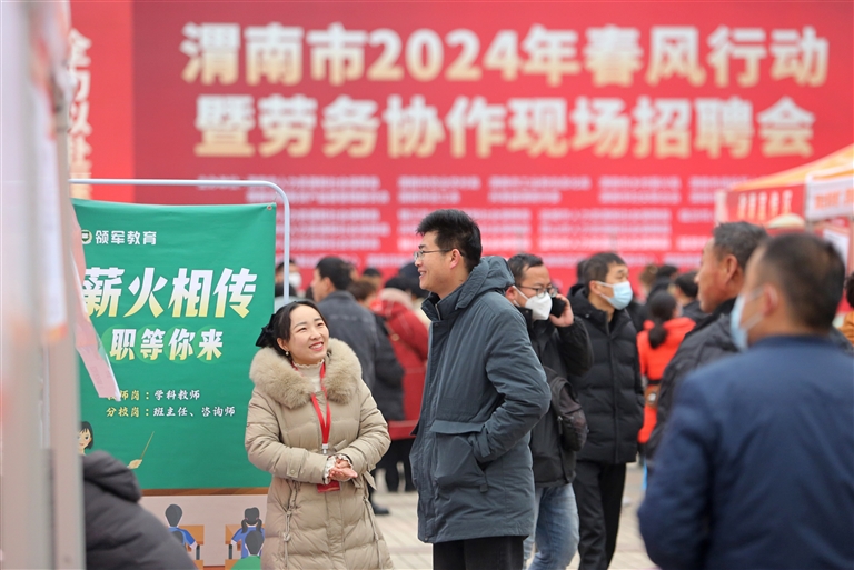 2月19日,求职者在陕西省渭南市2024年春风行动暨劳务协作现场招聘会了解企业招聘情况。