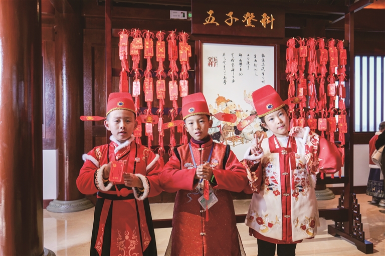 从及第廊参加“赶考”,经过投壶之礼、射箭考验、古诗问答、趣味蹴鞠等关卡,完成“赶考”闯关……现场设置的“小状元赶考记”闯关游戏,吸引了众多小朋友参与,让孩子们开心过年之余体验了“崇文重学”的文化底蕴。