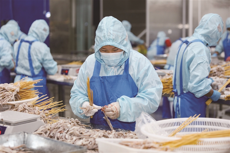 本报讯 身穿浅蓝色工作服,手脚麻利地用竹签串起鱿鱼须(见图)……2月19日,走进位于普陀展茅的浙江海欣水产有限公司,偌大的精深加工车间里,工人们正有条不紊地加工鱿鱼产品。抓生产、赶订单,让这片3.33万平方米的生产热土欣欣向荣。