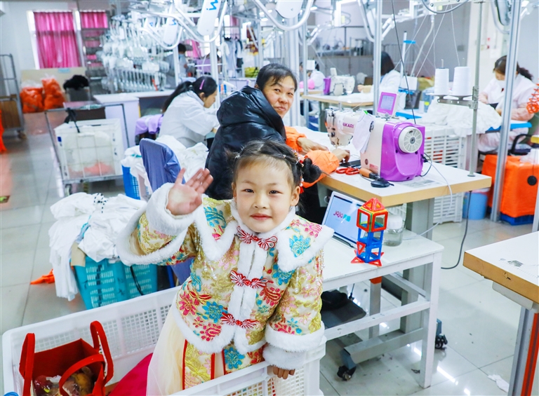 春节长假后,定海畚金针织服装厂抓紧复工赶订单。今年该企业针对一些女工的孩子还在放寒假的情况,推出人性化管理办法,允许制衣车间女工把孩子带在身边,直到寒假结束。摄影 记者 张磊