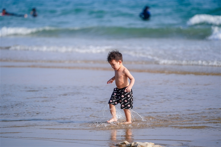 2月19日,一名小男孩在海南万宁石梅湾海滩游玩。