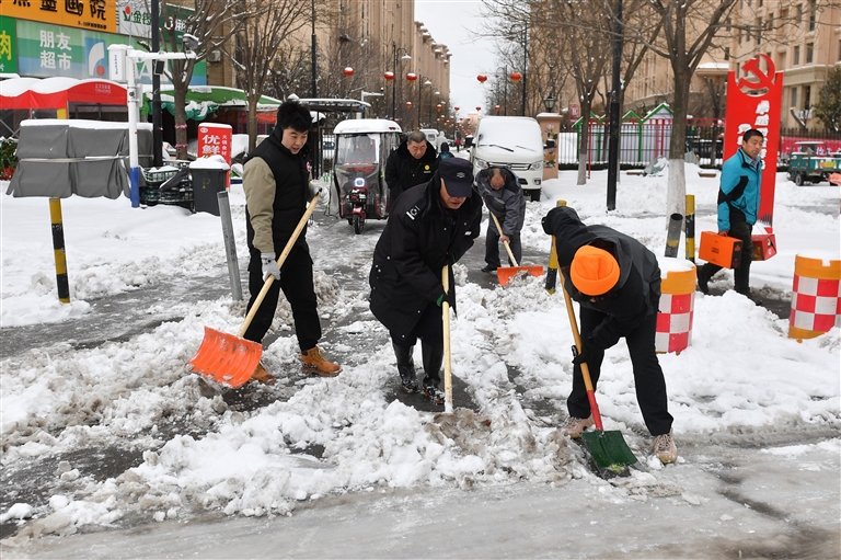 2月20日,在山东省青岛市城阳区,市民和物业管理人员在清除路面积雪。