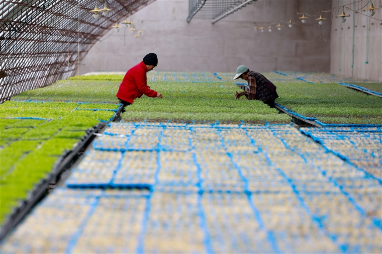 2月22日,工作人员在唐山市丰南区一家合作社的育苗棚内管护蔬菜秧苗。