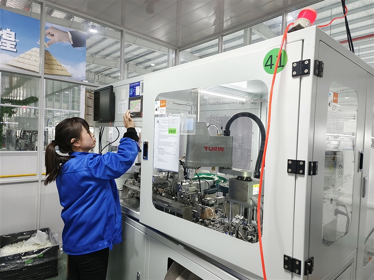 附件车间也是同样的生产景象,各类自动化设备高速运转,将各类零部件按照规定的顺序和方法进行组装。在一台堵头总成装配设备前,随着机械手臂的有序操作,穿弹簧、打铆钉、裁pvc管等工序自动完成,只有1名工人在旁看管。下转第3版▶