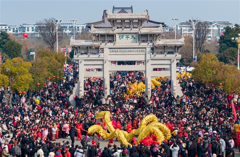 当日是农历正月十六,安徽省滁州市全椒县传统民俗活动“走太平”拉开帷幕,巡游队伍穿过太平桥,献上精彩纷呈的民俗表演。