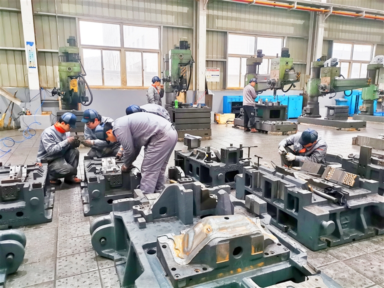 不远处,装配组组长袁艇与工友们一起,正在全力组装新车型模具(见图)。“我们把加工好的各个零件进行组装,完成装配后,再移交给调试组,对整个模具进行调试。”袁艇说,原先这样的装配工作,一台模具仅配置一人,现在为了既快又好地完成首样制作,三四个人同时开工,提升速度。