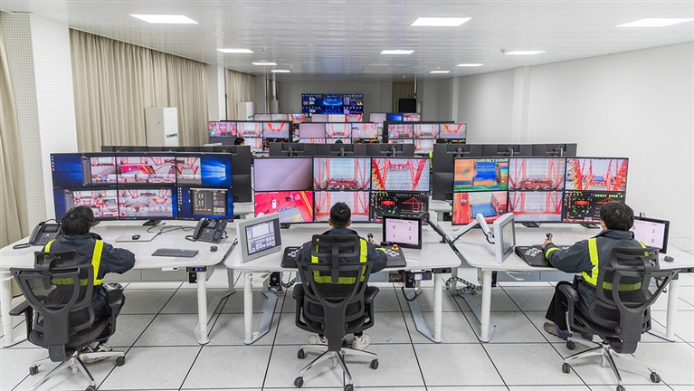 远程控制,正是甬舟公司智慧化之路的起点。2016年,经过一年多的摸索、改造,甬舟公司成功实现了远程控制“第一吊”;之后,又改造了一台远控龙门吊,实现远程一控二,助力自动化探索。依托宁波舟山港自主研发打造的“n-TOS+iECS”智慧“双芯”大脑,甬舟公司实现从触发式指令执行方式向智慧协同式指令执行方式的转变,做到当前任务信息与车队管理系统、堆场管理系统等无缝对接。目前,甬舟公司6成以上桥吊已实现远控半自动化操作;堆场52台轨道吊全部实现自动化运行,平均作业效率每小时25自然箱,较传统轨道吊提升近40%;41台无人集卡具备在港区与传统集卡深度混行的作业能力。