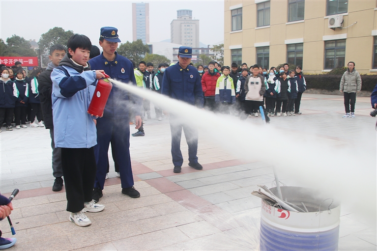 近日,普陀区六横镇蛟头初级中学、台门学校等开展消防安全“开学第一课”活动。学校举行火灾逃生应急疏散演练,请来当地消防队员教学生正确使用灭火器等。摄影 通讯员 刘生国 贺苗