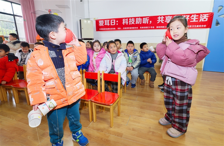 2月28日,湖州市第三幼儿园的小朋友用自制的传声筒感受音量对听力产生的影响。