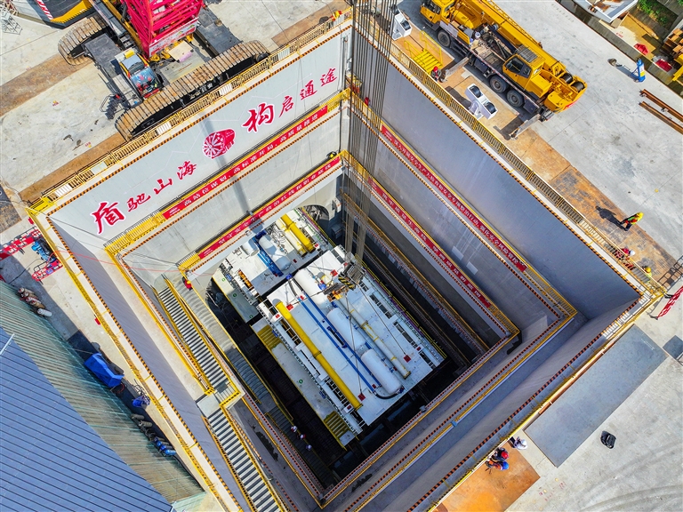 目前,盾构机4号至2号节台车已下井完成,定海号盾构机的牙齿(刀盘)正在同步组装焊接,预计4月10日左右完成刀盘下井。