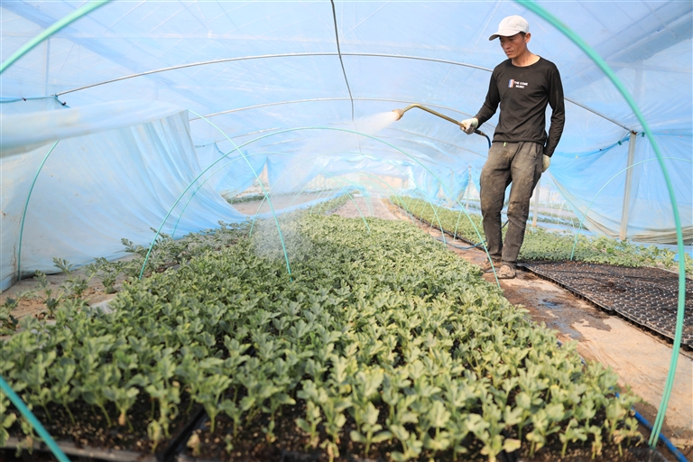 3月3日,岱山县岱西镇青黑村果蔬专业合作社的育苗大棚内,农户正在浇灌西瓜秧苗。近日,当地果农抓紧早春农时,忙着培育、移栽西瓜、东方蜜甜瓜等秧苗。摄影 记者 陈永建 滕海平