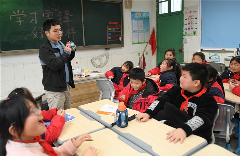 3月5日,志愿者张磊军带着学生们做团队建设游戏。