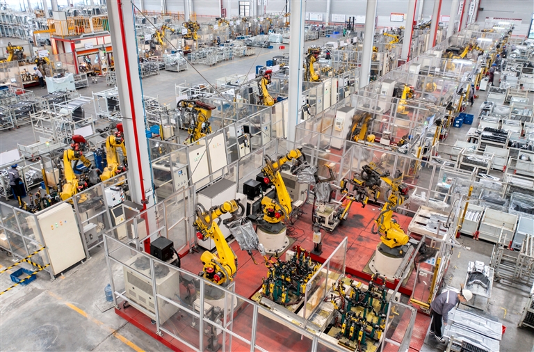 2024年1月8日,在位于浙江省湖州市长兴经济技术开发区的长兴地通汽车部件有限公司,全自动机器人高速运转生产新能源汽车配件订单产品(无人机照片)。 新华社 发(谭云俸 摄)