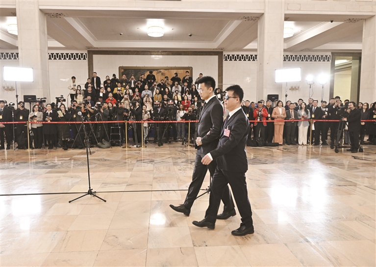 3月8日,在十四届全国人大二次会议第二场“代表通道”上,王永澄代表(前右)在工作人员的协助下前行,准备回答记者提问。
