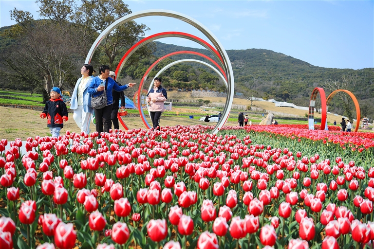 又到了踏青赏花的季节。近日,朱家尖大青山景区四季花海内的一整片郁金香迎着春风竞相绽放,美不胜收,吸引众多游人欣赏并留影。