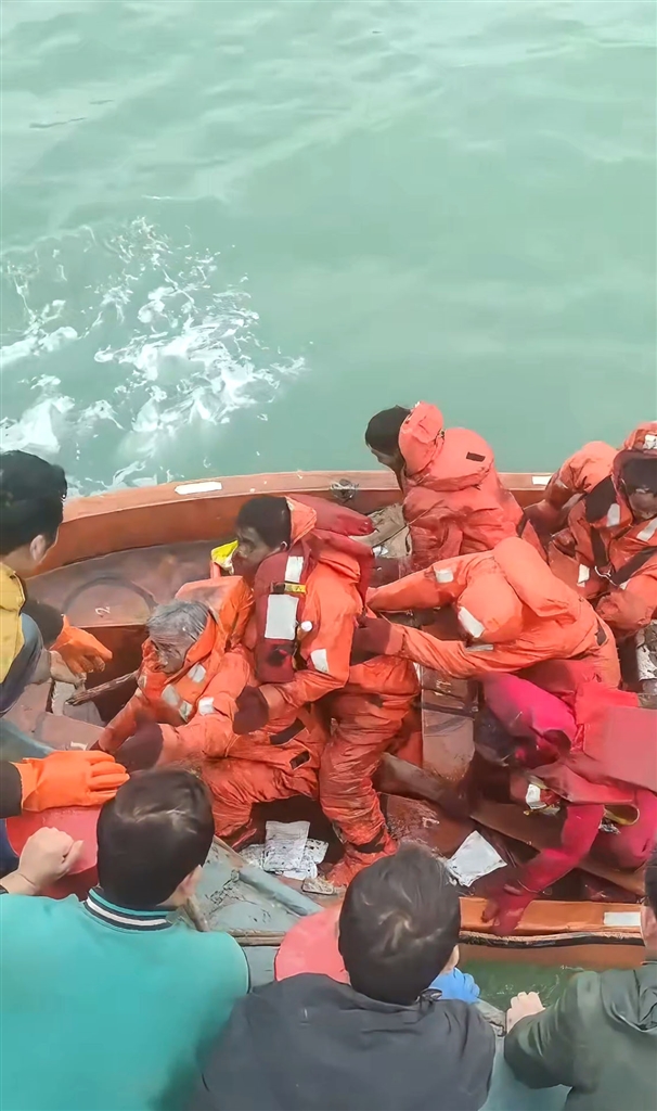 “浙岱渔11492”船抵达事发海域时,沈华忠看到有1个人落水了,还有15个人在救生筏上。他立刻指挥船员用钢梯将落水的人拉了上来。随后,又把救生筏上的15个人接上了船。整个救援过程不到半小时。