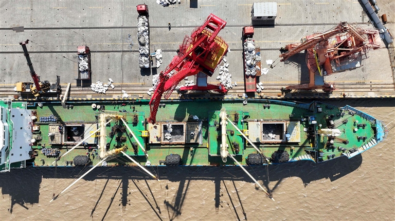 近日,舟山国家远洋渔业基地万吨级渔业专用码头机声隆隆,吊机正在卸载到港的成千上万吨远洋鱿鱼和金枪鱼。今年以来,该码头时常处于高负荷运转状态,远洋自捕鱼进关量累计已达14万吨。 摄影 记者 陈永建