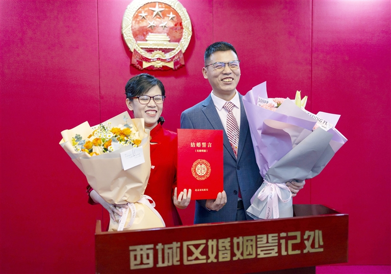 新人张女士和王先生在结婚宣誓后手持无障碍版结婚誓言和鲜花合影留念 新华社记者 才扬 摄