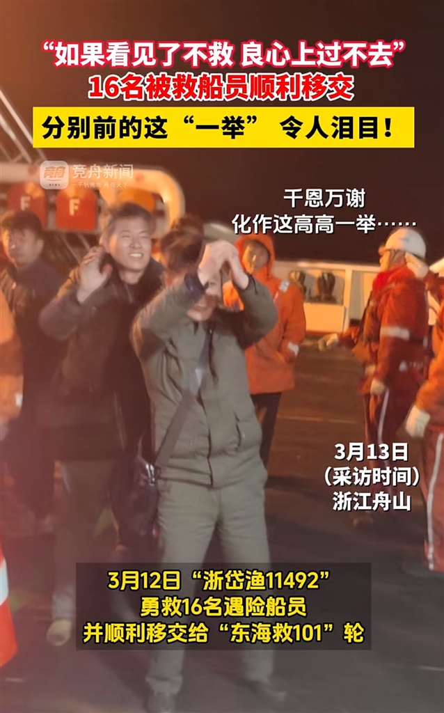 岱山渔船抛下近40万元的蟹笼,再次救上16名海上遇险人员,也赢得了一拨拨网友点赞:“沈船长大爱。”“英雄挽救了16个家庭。”“渔民兄弟刻在骨子里的善良和义气令人钦佩。”