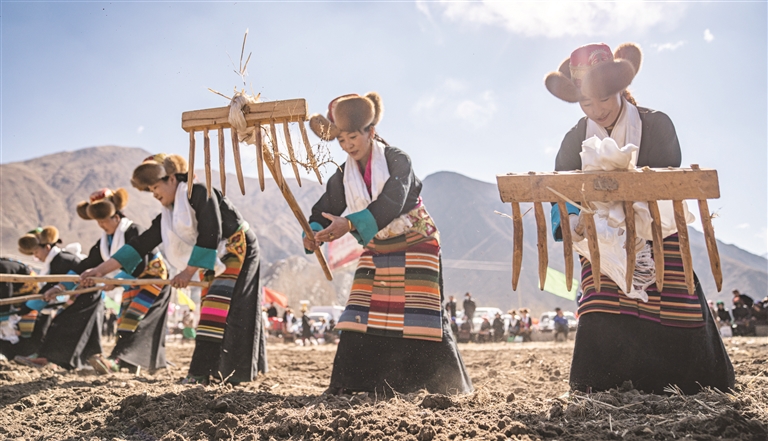3月16日,在西藏拉萨市堆龙德庆区马镇马村的春耕仪式现场,农民平整田地。