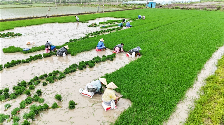昨天,普陀区六横镇的大片稻田里,种粮大户雇的工人正忙着拔秧。据了解,该镇原双塘、平峧盐场经过改造后,建造了1500多亩高准标农田。今年种植户创新采取了在普通水稻田大面积培育秧苗后,拔秧移植到由盐碱地改造的高标准农田的办法,争取今年水稻获得大丰收。 摄影 通讯员 刘生国
