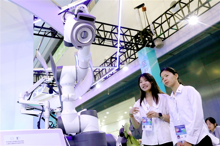 6月12日,观众在交易会上参观超声治疗机器人。