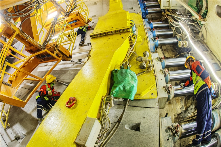 甬舟铁路金塘海底隧道舟山侧施工现场,中铁十一局集团的工人们在40多米深的海下进行盾构掘进、箱涵吊装、管片拼装,现场忙碌有序摄影 通讯员 姚峰 周俊 周法庭