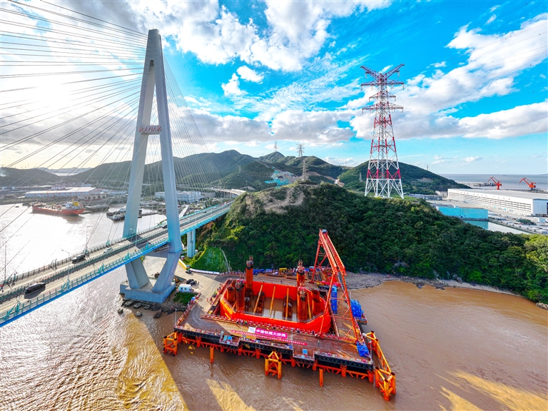 11月23日,甬舟铁路桃夭门公铁两用大桥五号主墩钢围堰成功下放,为主墩承台及主塔建设打下坚实的基础。据了解,五号主墩围堰重约1700吨,系模块化拼装整体下放工艺双壁钢吊箱围堰。桃夭门公铁两用大桥连接册子岛和富翅岛,与已有的甬舟(G9211)高速桃夭门大桥并行,长1531.595米,主跨666米,是目前世界最大跨度公铁两用混合梁斜拉桥,大桥设计为公路和铁路同层通行。 摄影 通讯员 姚峰 祁春寒