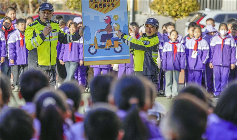 11月29日,河北省遵化市交警大队民警在遵化市第六实验小学宣传交通安全知识。12月2日“全国交通安全日”到来之际,各地开展交通安全主题宣传教育活动,提高学生交通安全意识和自我保护能力。 新华社 发(刘满仓 摄)