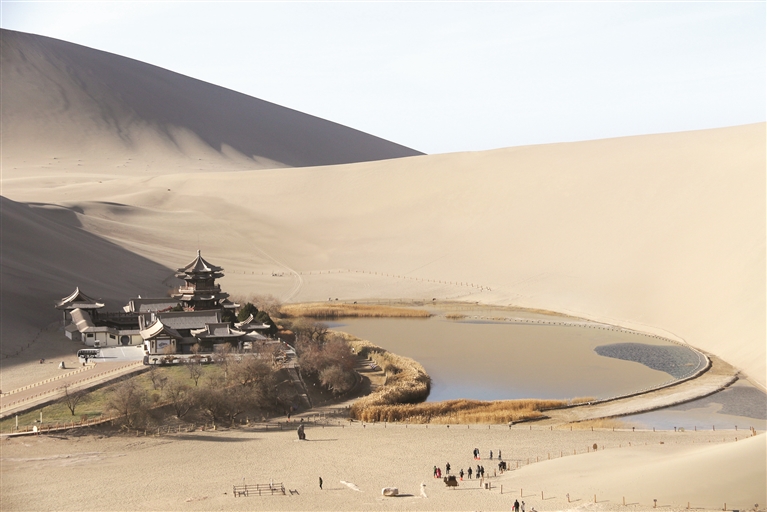 12月1日,游客在甘肃省敦煌市鸣沙山月牙泉景区游览。