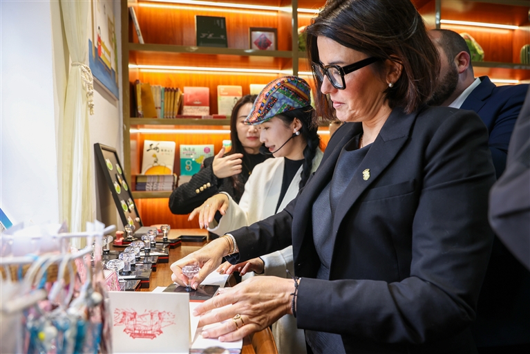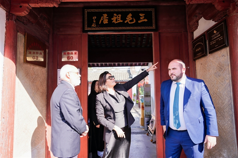 走进三毛祖居,代表团一行人认真聆听了三毛生平介绍,从三毛把自己的本名改掉、求学时经历的事情,再到远赴异国他乡及书写人生百态的文学创作历程。每一幅照片、每一件物品都让大家感受着三毛血液中流淌的自由精神与不羁情怀。在“心忆空间”小沙女共富工坊,代表团一行被工坊内的非遗文化手作所吸引。巴勃罗上手体验了海岛布织,感受当地的三毛文化衍生产业。